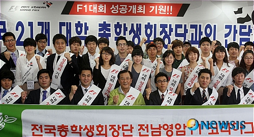 【무안=뉴시스】송창헌 기자 = 박준영 전남지사가 10일 오전 전남도청 서재필실에서 열린 F1대회 성공개최 기원 대학교 총학생회장단과 기념촬영하고 있다. 이날 행사에는 전국 21개 대학생 60여명이 참석해 F1 코리아 그랑프리의 지지 기반 형성과 학생들의 자발적 참여를 다짐했다.(사진=전남도 제공)