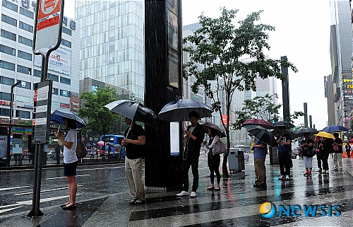 【서울=뉴시스】박상훈 인턴기자 = 중부지방에 오늘 하루 150mm 이상의 강수량이 예상되는 가운데 11일 오전 서울 강남에서 출근길 시민들이 버스를 기다리고 있다.