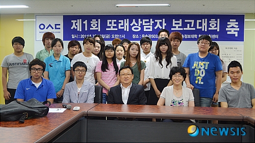 【대전=뉴시스】유순상 기자 = 우송정보대학이 15일 교내에서 제1회 또래상담자 보고대회를 개최한 가운데 박승익 총장과 또래상담자들이 기념촬영을 하고 있다. (사진=우송정보대 제공)