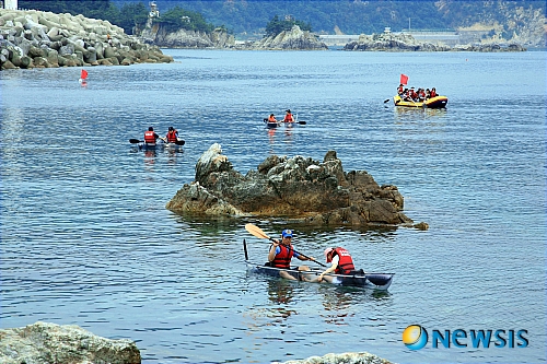 【삼척=뉴시스】조병수 기자 = 제4회 장호 어촌체험축제가 29일부터 8월 1일까지 빼어난 풍경을 자랑하는 강원 삼척시 장호항 일원에서 '장호 바다와 우리 가족의 만남'이라는 주제로 열린다. 사진은 지난해 여름 열린 축제에서 관광객들이 투명카누 생태체험을 즐기고 있다. (사진=삼척시청 제공)
