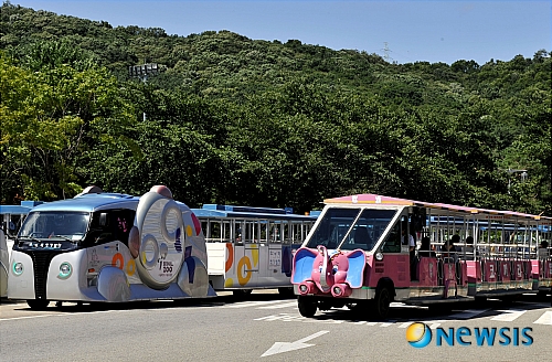 【과천=뉴시스】박문호 기자 = 19일 오전 경기 과천 문원동 서울대공원에서 세계최초로 무선충전 방식을 이용한 서울대공원 코끼리전기열차옆으로 경유방식의 코끼리열차가 지나고 있다.