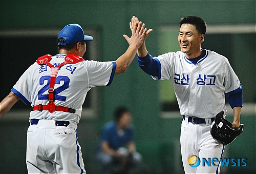 【서울=뉴시스】박세연 기자 = 22일 오후 서울 목동야구장에서 열린 경남고VS군산상고 '레전드 리매치' 경기가 열렸다. 5회말 군산상고 이광우 선수가 홈베이스를 밟은 후 최해식 선수와 하이파이브를 하고 있다.