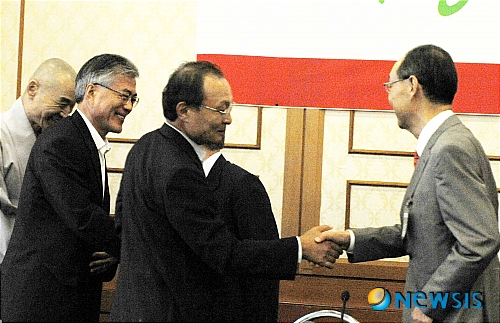 【서울=뉴시스】권주훈 기자 = 26일 오전 국회 귀빈식당에서 열린 희망 2013·승리 2012 원탁회의끝낸 백낙청 명예교수와 이해찬 전 총리, 문재인 노무현재단 이사장이 악수 하고 있다..
