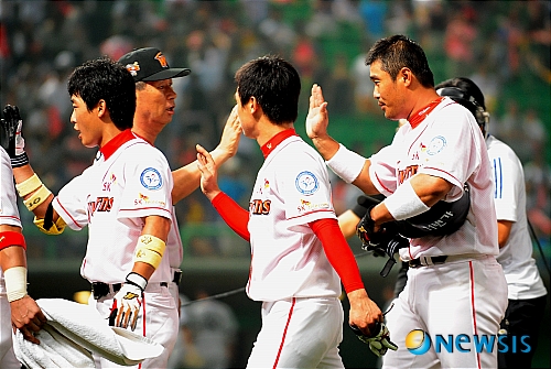 【인천=뉴시스】이동원 기자 = 3일 오후 인천문학야구장에서 2011 프로야구 SK와이번스와 LG트윈스의 경기가 열렸다. 9회말 SK공격 1사 1루상황 이호준이 역전 끝내기 투런홈런을 날리며 팀을 5대4 승리 견인, 경기종료후 이호준이 김성근감독과 하이파이브를 나누고 있다.