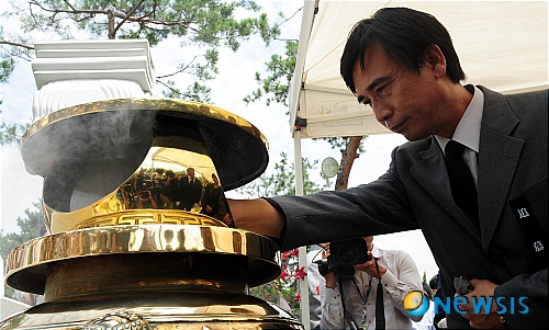 【서울=뉴시스】박주성 기자 = 국민참여당 유시민 대표가 18일 오전 서울 동작구 국립서울현충원에서 열린 김대중 대통령 서거 2주기 추도식에서 고인에게 분향을 하고 있다.