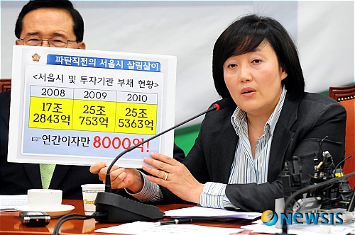 【서울=뉴시스】이광호 기자 = 민주당 박영선 정책위의장이 23일 오전 국회에서 열린 원내대책회의에서 서울시 및 투자기관 부채 현황에 대해 설명하고 있다.