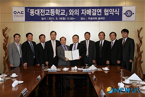 【대전=뉴시스】유순상 기자 = 박승익(오른쪽 다섯번째) 우송정보대학 총장과 장길환(여섯번째) 동대전고 교장이 19일 대학 우송타워 13층 솔파인에서 자매결연 협약식을 체결한뒤 양기관 관계자들과 기념촬영을 하고 있다.(사진=우송정보대 제공)