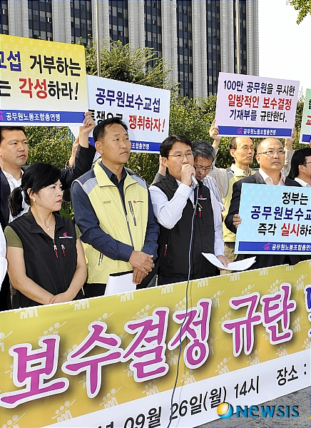 【서울=뉴시스】최동준 기자 = 공무원노동조합총연맹 회원들이 26일 오후 서울 종로구 정부중앙청사 정문 앞에서 '일방적 공무원 보수결정 규탄 및 보수교섭 쟁취를 위한 기자회견'을 개최, 정의용(가운데) 공무원노동조합총연맹 위원장이 대회사를 하고 있다.
