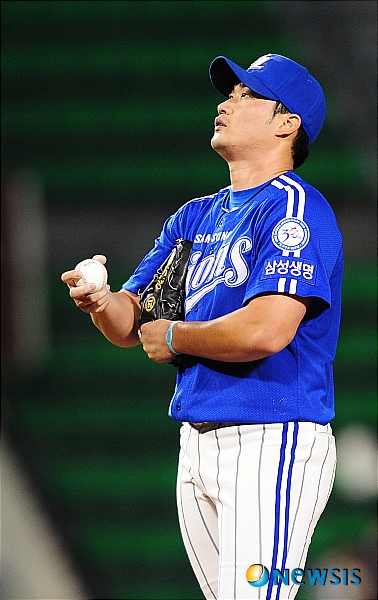 【서울=뉴시스】김인철 기자 = 28일 오후 서울 잠실야구장에서 2011 프로야구 두산베어스와 삼성라이온즈의 경기가 열렸다. 9회말 2사 상황 두산 고영민 타석때 삼성 오승환이 역투 하고 있다.