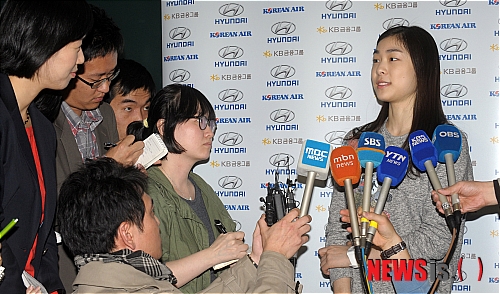 【인천공항=뉴시스】조종원 기자 = 피겨여왕 김연아 선수가 오는 19일 개최되는 2018 평창동계올림픽 조직위원회 첫 총회에 참석하기 위해 18일 오후 인천국제공항을 통해 입국해 취재진들과 인터뷰를 하고 있다.