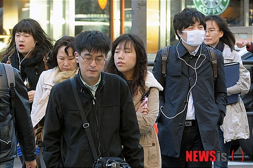 【서울=뉴시스】박동욱 기자 = 가을 추위가 이어지고 있는 19일 오전 서울 종로2가 사거리에서 시민들이 출근길 발걸음을 옮기고 있다.