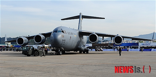【성남=뉴시스】문승배 기자 = 20일 경기 성남 서울공항에서 개최된 SEOUL ADEX 2011 행사에서 미공군의 거대 수송기 C-17 Globemaster III 가 이륙을 위해 견인 되고 있다. 최대적재능력은 76,657kg 달하며 항속속도 마하 0.74∼0.77 이다.