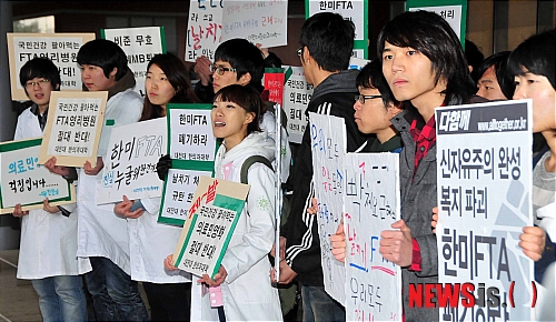 【대전=뉴시스】홍성후 기자 = 한·미 자유무역협정(FTA) 비준동의안이 지난 22일 한나라당의 일방처리로 국회 본회의에서 통과된 가운데 23일 오후 대전대에서 한의과 학생들이 한나라당 박근혜 전 대표의 특강을 앞두고 FTA원천 무효를 주장하며 집회를 갖고 있다.