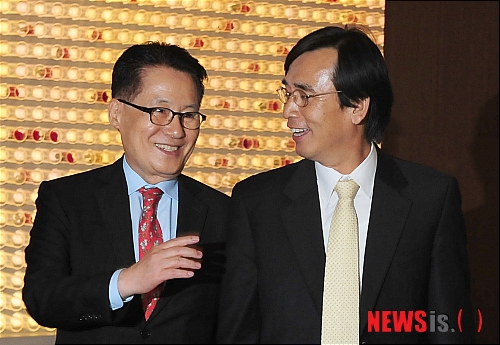 【서울=뉴시스】김영욱 기자 = 8일 오후 서울 여의도 63빌딩에서 열린 김대중 대통령 노벨평화상 수상 11주년 기념 '제1회 김대중국제평화학술회의'에 참석한 민주당 박지원 전 원내대표(왼쪽)와 통합진보당 유시민 공동대표가 웃으며 들어서고 있다.