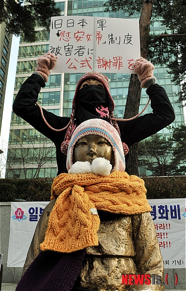 【서울=뉴시스】전진환 기자 = 20일 오후 서울 종로구 중학동 주한일본대사관 앞에서 한 일본여성이 '소녀상을 철거하지말고 위안부 할머니들에게 사과하라'는 손피켓을 들고 일인시위를 하고 있다