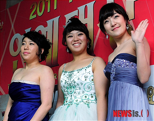 【서울=뉴시스】박문호 기자 = 개그우먼 김영희, 권미진, 정은선이 24일 오후 서울 여의도 KBS신관에서 '2011 KBS 연예대상' 시상식에 참가해 포토월에서 포즈를 취하고 있다.