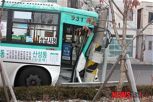 【수원=뉴시스】이승호 기자 = 31일 오전 9시55분께 경기 성남시 산선동 한 시내버스 차고지 비탈길에 정차해 놓은 버스가 20m 아래로 굴러 전신주를 들이받았다. 당시 전신주를 들이받은 시내버스.(사진 = 성남수정경찰서 제공)