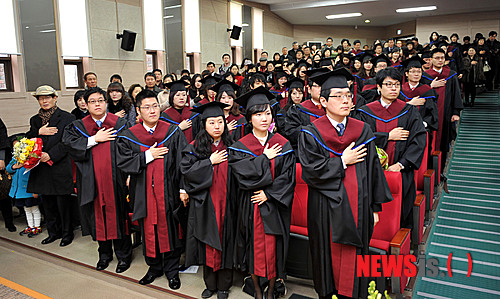 【광주=뉴시스】류형근 기자 = 21일 오전 전남대학교 법학전문대학원(법전원) 111호 강당에서 졸업생 80여명이 참여한 가운데 제1회 법전원 학위수여식이 열리고 있다. 졸업생들이 국민의례를 하고 있다.