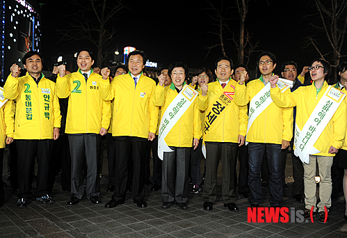 【서울=뉴시스】조성봉 기자 = 제19대 국회의원 공식 선거운동이 본격적으로 시작된 29일 오전 서울 중구 두타 앞에서 한명숙 민주통합당 대표를 비롯한 지도부와 총선 후보자들이 유권자들에게 지지를 호소하며 화이팅을 외치고 있다.