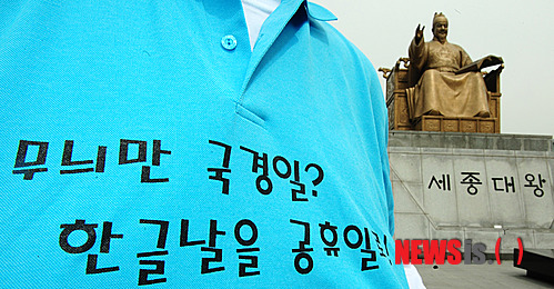 【서울=뉴시스】김기태 기자 = 한글날 공휴일 추진 범국민연합 구성원이 13일 오전 서울 종로구 세종로 광화문광장 세종대왕동상 앞에서 한글날을 공휴일로 만들자는 문구가 적힌 티셔츠를 들어 보이고 있다.