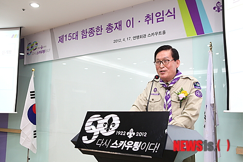 【서울=뉴시스】한국스카우트연맹은 17일 오후 서울 여의도 한국스카우트연맹 회관에서 제15대 함종한(咸種漢) 총재 취임식을 개최했다. 정원식 전 국무총리, 안재헌 한국청소년활동진흥원 이사장, 강영중 전 총재(대교그룹 회장) 등 관계자 180여명이 자리해 새롭게 나아갈 스카우트의 미래를 함께 응원했다. (사진=한국스카우트연맹 제공)