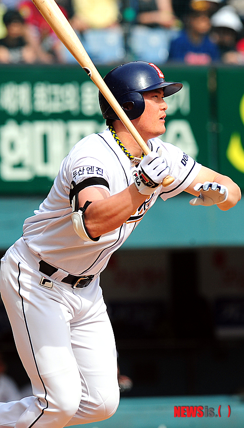 【서울=뉴시스】김인철 기자 = 29일 오후 서울 잠실야구장에서 열린 2012 팔도 프로야구 두산 베어스와 KIA 타이거즈의 경기에서 6회말 두산공격 1사 상황 두산 이성열이 우전 1루타를 날리고 있다.