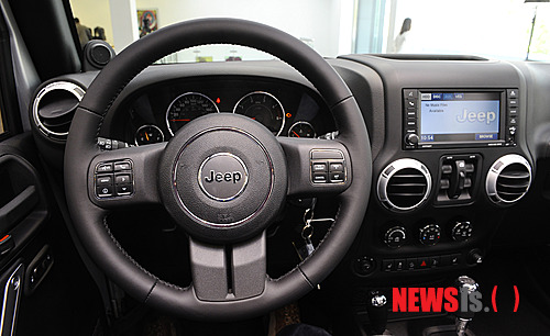 【서울=뉴시스】조종원 기자 = 7일 오전 서울 강남구 청담전시장에서 크라이슬러 코리아가 새롭게 출시된 Jeep 랭글러 언리미티드 사하라를 선보이고 있다. 사진은 차량의 핸들. Jeep 랭글러 사하라는 2도어인 랭글러 사하라와 4도어인 랭글러 언리미티드 사하라 모델로 구성되어 있고 2.8L CRD 터보 디젤 엔진을 탑재해 최대 출력 200마력과 최대 토크 46.9kg.m의 퍼포먼스를 발휘한다. 고속도로주행 기준으로 랭글러 사하라는 10.4km/L, 랭글러 언리미티드 사하라는 9.9km/L의 연비를 실현했으며 각각 214/km와 222/km의 적은 이산화탄소 배출량으로 EURO 5 기준을 충족하고 바디와 동일한 색상의 프리덤 하드탑과 펜더 디자인, 승하차가 용이한 사이드 스텝 등을 적용해 고급스러운 외관을 완성했다고 전했다.