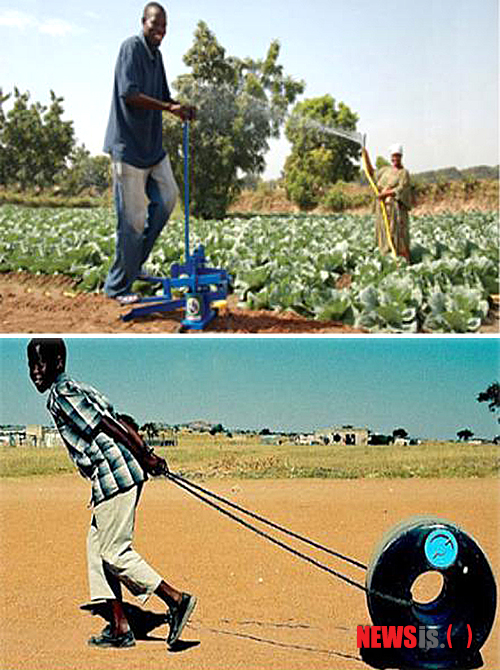 사진 위쪽은 1991년 케냐에서 개발된 '머니메이커'로, 발로 밞아서 농작물에 안정적인 용수를 공급하는 기계다. 아래쪽은 굴리는 물통인 '큐드럼(Q Drum)'으로, 1993년 남아공에서 만들어진 큐드럼은 깨끗한 물을 갖고 먼길을 쉽게 이동할 수 있도록 만든 기계다. (사진=굿네이버스 제공)