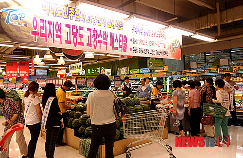 【고창=뉴시스】김종효 기자 = 21일 전북 고창군은 명품수박인 '고창스테비아수박'을 내달 5일까지 전국 이마트 30개점에서 판매한다고 밝혔다. 전주 이마트의 고창스테비아수박 판매코너가 수박을 사기위한 시민들로 붐비고 있는 모습이다. (사진 = 고창군 제공)