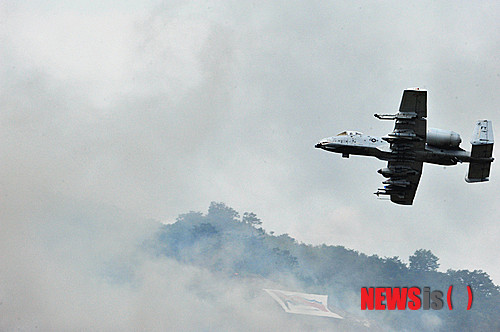 【포천=뉴시스】박문호 기자 = 지난 19일 오후 경기도 포천 이동면 승진훈련장에서 열린 한미연합 '2012 통합화력전투 사전훈련'에서 A-10 선더볼트가 낮은 고도로 적진을 공략하고 있다.