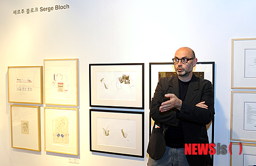 【서울=뉴시스】박상훈 기자 = 프랑스 동화책 작가인 '세르주 블로크'가 16일 오후 서울 세종문화회관 미술관에서 열린 프랑스 대표 그림책 작가전에서 자신의 일러스트를 설명하하고 있다.