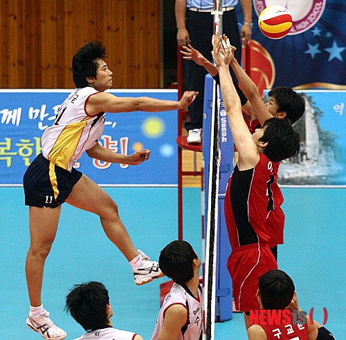 【단양=뉴시스】조성봉 기자 = 24일 충북 단양군 문화체육센터에서 열린 제46회 대통령배 전국남녀중고배구대회 남자고등부 벌교제일고-수성고 경기에서 수성고 안성균의 공격을 벌교제일고 이현우가 블로킹하고 있다. (사진=스포츠포커스 김경수 제공)