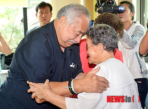 【광주=뉴시스】최동준 기자 = 20일 오전 경기 광주시 퇴촌면 위안부 피해 할머니의 보금자리 나눔의 집을 방문한 미 연방 하원 '위안부 결의안' 채택의 주역인 에니 팔레오마베가 의원이 위안부 피해 박옥선 할머니와 인사를 나누고 있다.