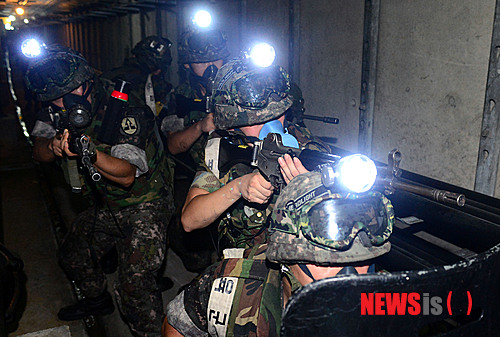 【서울=뉴시스】박동욱 기자 = 2012 을지프리덤가디언(UFG) 훈련이 실시되고 있는 21일 오후 서울의 한 지하구에서 52사단 장병들이 민·관·군·경 합동훈련을 실시하고 있다.