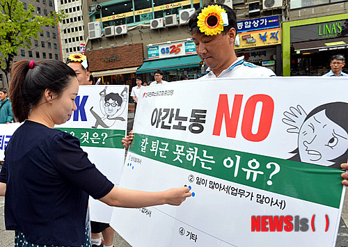 【서울=뉴시스】박문호 기자 = 22일 오전 서울 영등포구 여의도역 일대에서 열린 '노동시간 단축·일자리 창출 위한 정시퇴근운동' 캠페인에서 지나던 직장인들이 정시퇴근하지 못하는 이유와 퇴근 후 하고 싶은 일에 대한 조사에 응하고 있다.