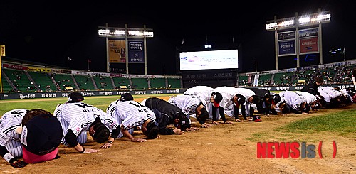 【서울=뉴시스】전신 기자 = 3일 오후 서울 잠실야구장에서 2012 팔도 프로야구 LG 트윈스와 SK 와이번스의 경기가 펼쳐졌다. 마지막 홈 경기를 3-2 승리로 이끈 LG 트윈스 김기태 감독과 선수들이 관중들에게 큰절을 하고 있다.