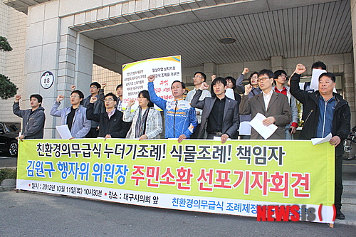 【대구=뉴시스】박광일 기자 = 11일 오전 '친환경 의무급식 조례제정 대구운동본부' 회원들이 대구시의회 앞에서 기자회견을 갖고 "김원구 대구시의회 행정자치위원장이 친환경의무급식 조례를 누더기 조례로 만든 주범"이라며 "주민소환을 통해 시의원 자격을 박탈할 것"이라고 밝히고 있다.
