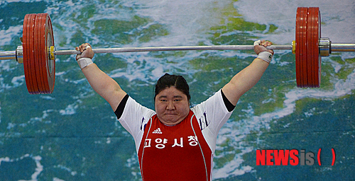 【대구=뉴시스】김인철 기자 = 여자 역도의 간판 장미란(고양시청)이 15일 오전 대구 엑스코에서 열린 제93회 전국체육대회 역도 여자 일반부 75kg 이상급 경기 인상 2차시기에서 120kg을 들어올리고 있다.