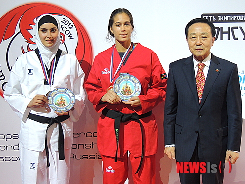 【서울=뉴시스】최동준 기자 = 제1회 유럽-아시아대륙간태권도선수권대회가 12일 러시아 모스크바에서 개최되었다. 이번 대회에는 남자 단체전 4경기 및 남녀 올림픽 체급 개인전8 경기가 치러졌다. 여자 +67KG 체급 경기에서 네델란드의 레슈미 우깅크 선수가 요르단의 리마 아난베 선수를 5대1로 승리후 시상식을 갖고 있다. (사진=세계태권도연맹 제공)