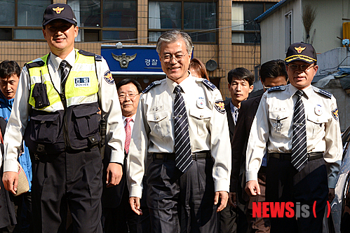 【서울=뉴시스】조성봉 기자 = 민주통합당 문재인 대통령 후보가 19일 오후 서울 종로구 숭인동 혜화경찰서 동묘 파출소를 방문, 경찰복을 입고 동묘파출소 경찰들과 함께 순찰을 돌기 위해 파출소를 나서고 있다.