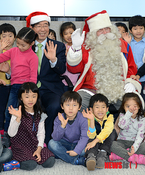 【서울=뉴시스】조수정 기자 = 17일 서울 시청 신청사에서 박원순 서울시장과 핀란드에서 온 공인산타클로스가 '성탄기념 시청어린이집 어린이와 만남'행사에서 어린이들과 기념촬영 하고 있다.