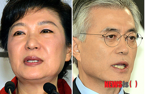 【서울=뉴시스】권주훈 ·조성봉 기자 = 18대 대통령선거 투표일을 하루 앞둔 18일 오전 새누리당 박근혜(왼쪽) 대통령후보와 민주통합당 문재인 대통령 후보가 각각 서울 여의도 당사 기자실과 영등포구 중앙당사에서 진인사대천명 (盡人事待天命)의 마음으로 기자회견을 하고 있다.