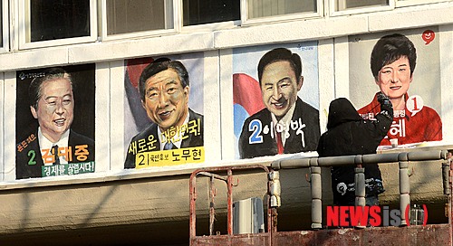 역대 대통령 선거포스터 작회되는 선거연수원 외벽