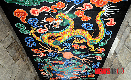 【서울=뉴시스】최동준 기자 = 31일 오후 '국보 1호' 서울 중구 숭례문의 막바지 복원 작업이 한창인 가운데 홍예문 천장의 용 문양이 모습을 드러내고 있다. 화염에 휩싸인 지 5년 만인 내년 2월 10일 시민들에게 공개될 예정이다.