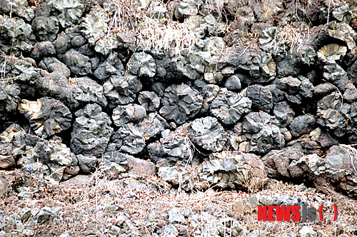 【대전=뉴시스】박희송 기자 = 문화재청은 12일 용암이 강물과 만나면서 베개 모양의 특이한 형태로 굳은 '포천 아우라지 베개용암'을 국가지정문화재 천연기념물 제542호로 지정했다. 사진은 포천 베개용암. (사진=문화재청 제공)