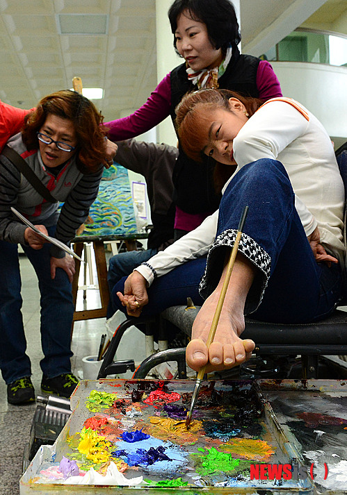 【서울=뉴시스】박동욱 기자 = 33회 장애인의 날을 나흘 앞둔 17일 오전 서울 삼전동 송파구민회관에서 장애인 그림 동호회 '화사랑'의 구족화가 김경아(45)씨가 그림을 그리고 있다.