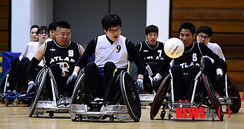 【서울=뉴시스】전신 기자 = 28일 오후 서울 관악구 서울대학교 체육관에서 열린 서울컵 제5회 전국휠체어럭비 선수권대회에서 쿼드 결승전 경북 아틀라스Q와 서울 헌터스의 경기에서 헌터스 이장규가 공을 쫓아가고 있다.