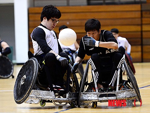 【서울=뉴시스】전신 기자 = 28일 오후 서울 관악구 서울대학교 체육관에서 열린 서울컵 제5회 전국휠체어럭비 선수권대회에서 쿼드 결승전 경북 아틀라스Q와 서울 헌터스의 경기에서 아틀라스Q 정종혁이 패스를 시도하고 있다.