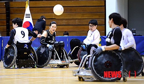 【서울=뉴시스】전신 기자 = 28일 오후 서울 관악구 서울대학교 체육관에서 열린 서울컵 제5회 전국휠체어럭비 선수권대회에서 쿼드 결승전 경북 아틀라스Q와 서울 헌터스의 경기에서 아틀라스Q 김소영이 패스를 시도하고 있다.