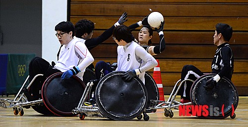 【서울=뉴시스】전신 기자 = 28일 오후 서울 관악구 서울대학교 체육관에서 열린 서울컵 제5회 전국휠체어럭비 선수권대회에서 쿼드 결승전 경북 아틀라스Q와 서울 헌터스의 경기에서 아틀라스Q 김소영이 패스를 시도하고 있다.